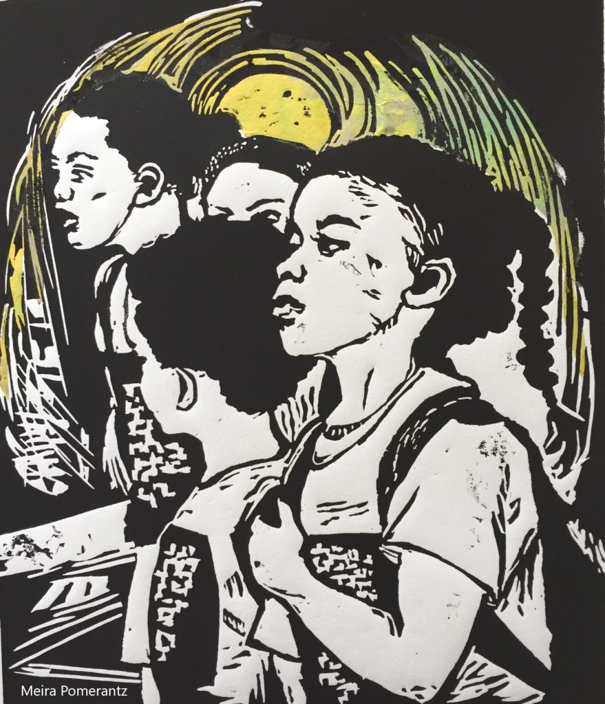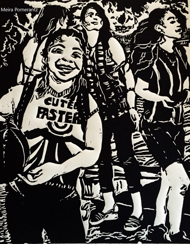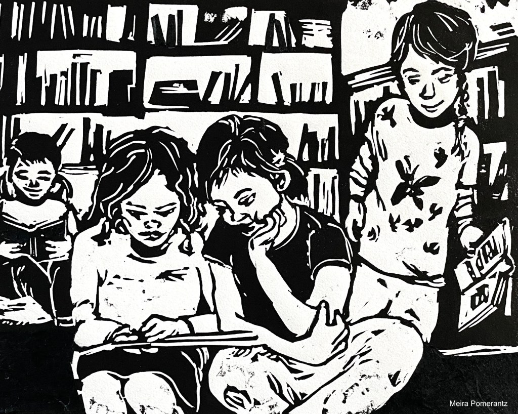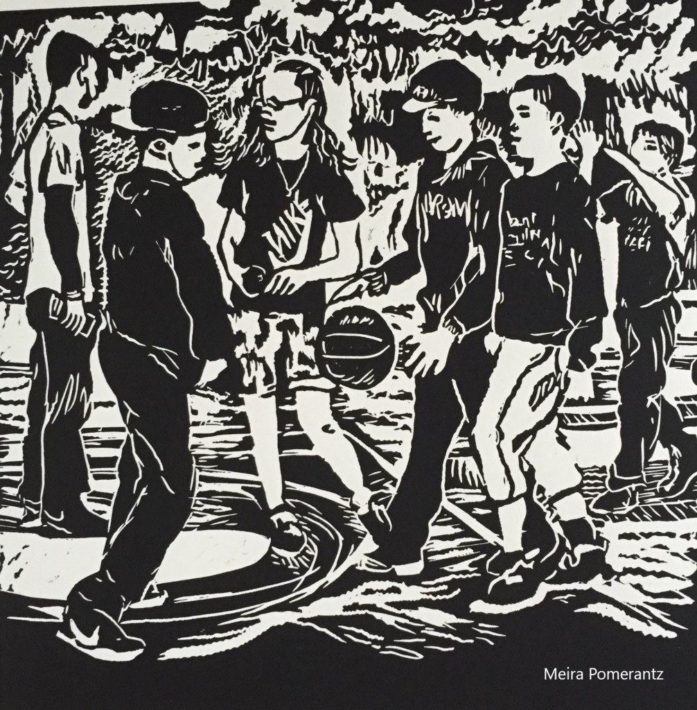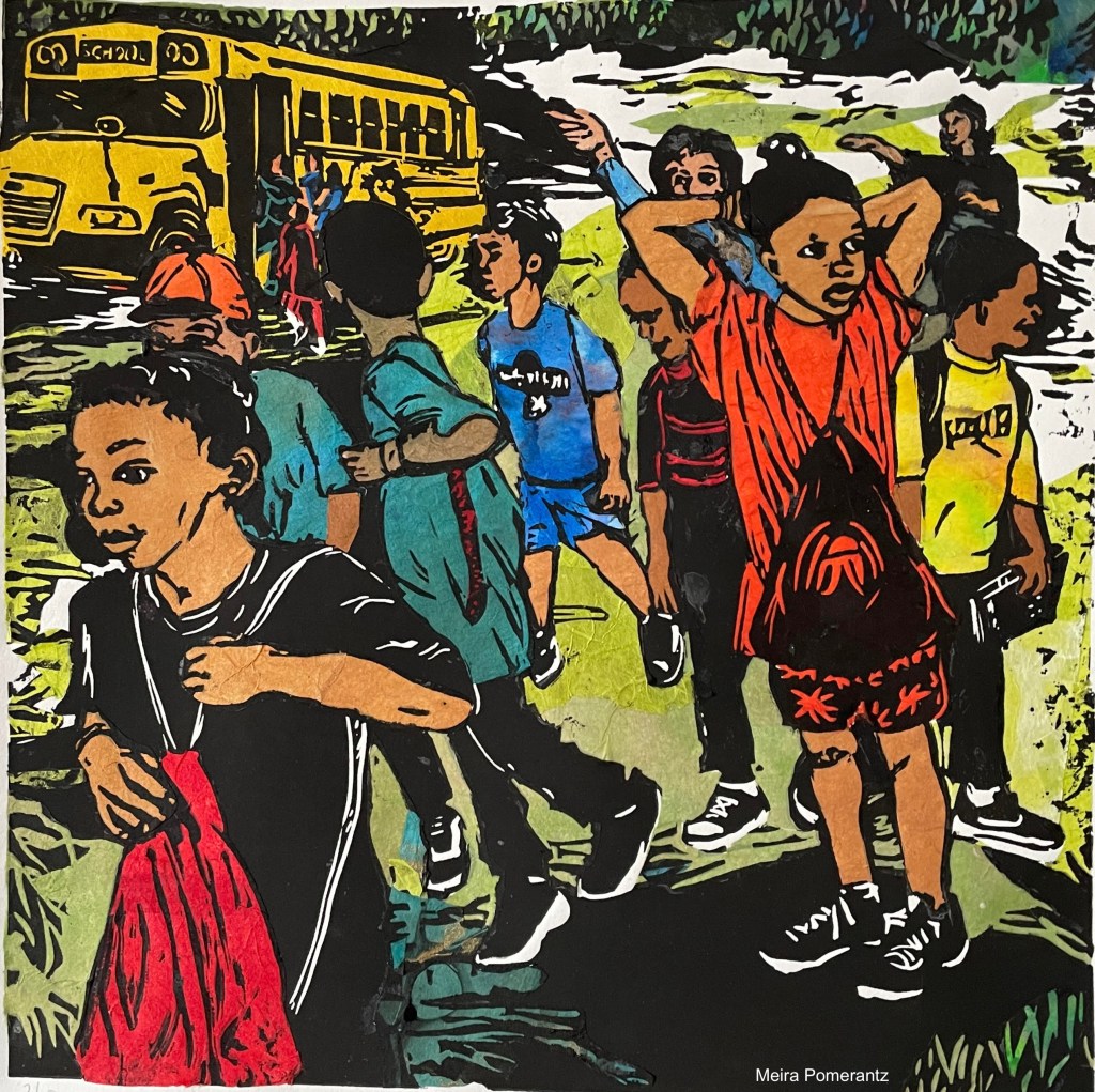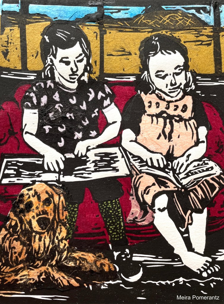 School Yard, 12 x 12 Reading With Dog, 6 x 8Music Class, 7.5 x 9.5They’re Safe For Now, 18 x 24Curls, 14 x 10Basketball, 12 x 12Rainy Day At Camp, 12.5 x 10